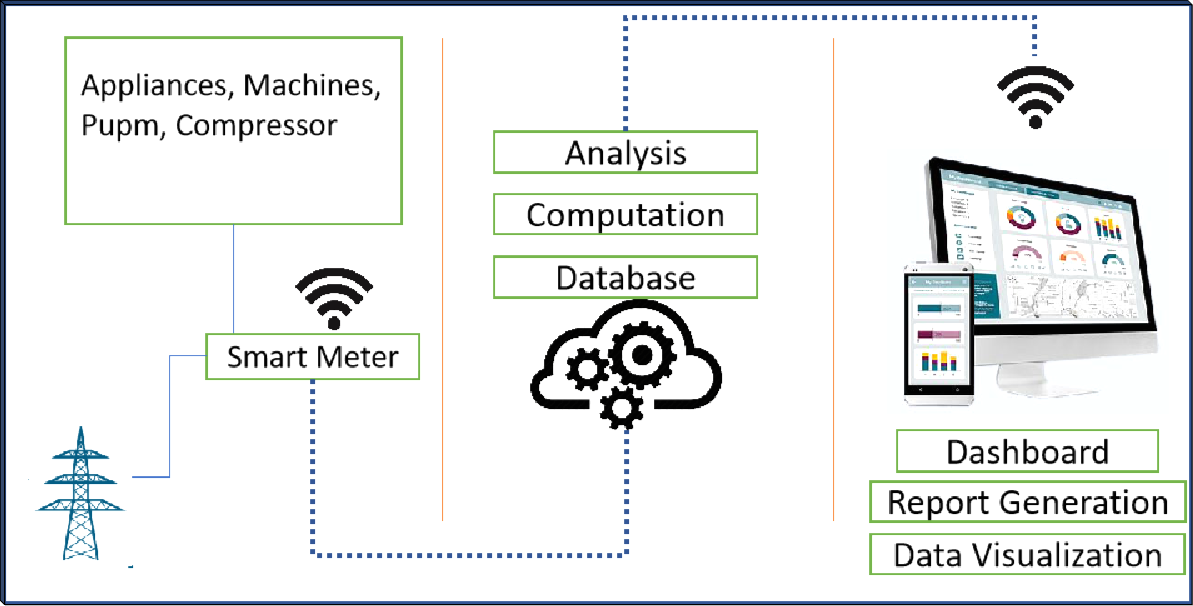 Energy Monitoring Solution is a smart way of tracking real time energy consumption of a specific machine, group of machines, Industry, Home, etc and henceforth deriving Machine utilization at various intervals by leveraging the Internet of Things. It is also plug gable to any premises, industries or building.